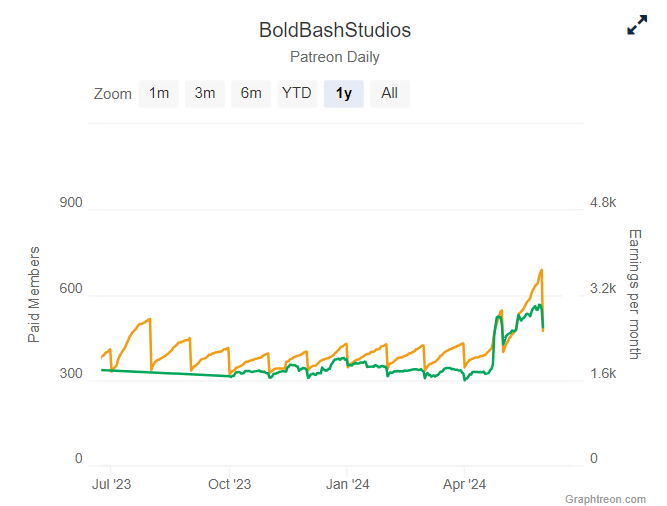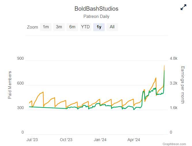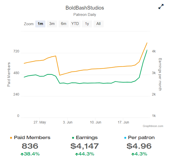 BoldBashStudios had been growing steadily over the three years its Patreon had been online, reaching 580 monthly subscribers to its project. But in just 3 days online at oppaiman.com, it has jumped to over 830 subscribers.