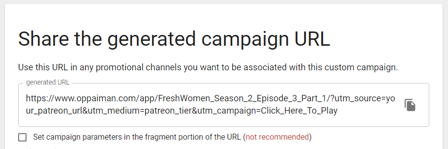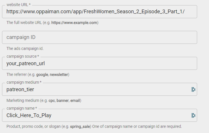 - campaign source: your_patreon_url (e.g. if your Patreon URL is https://www.patreon.com/StrandedWithBenefits; you write StrandedWithBenefits)