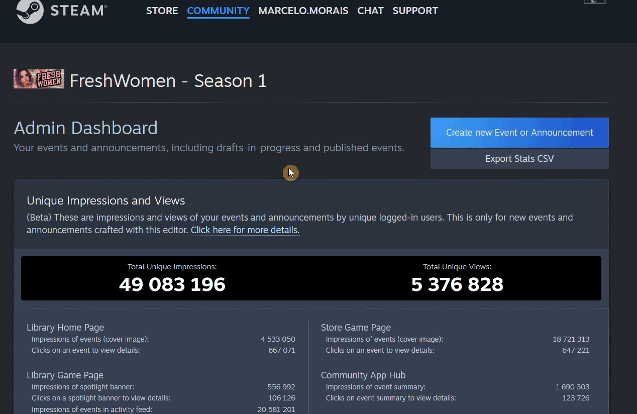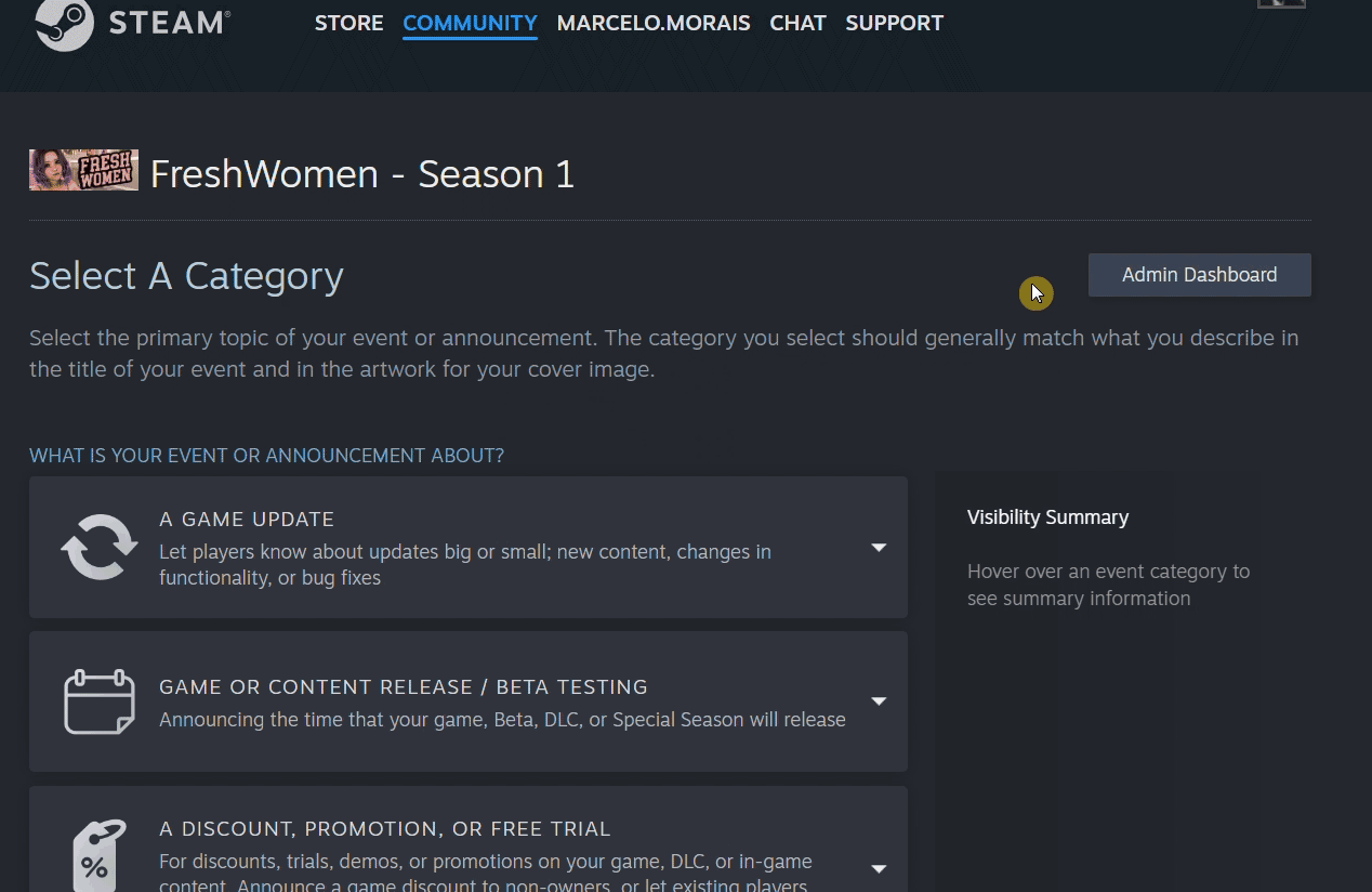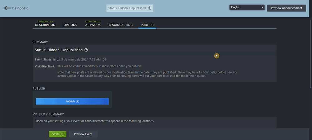 Roll the page and click on "Post/Manage Events & Announcements"(https://steamcommunity.com/games/1350650/partnerevents/)