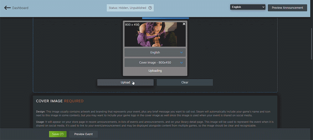 Now click on the tab Artwork, select "English" and upload a cover image. (You can upload a different image for each language, but if your image does not have any text, you can just upload it in English and Steam will automatically apply the same cover for all languages.)