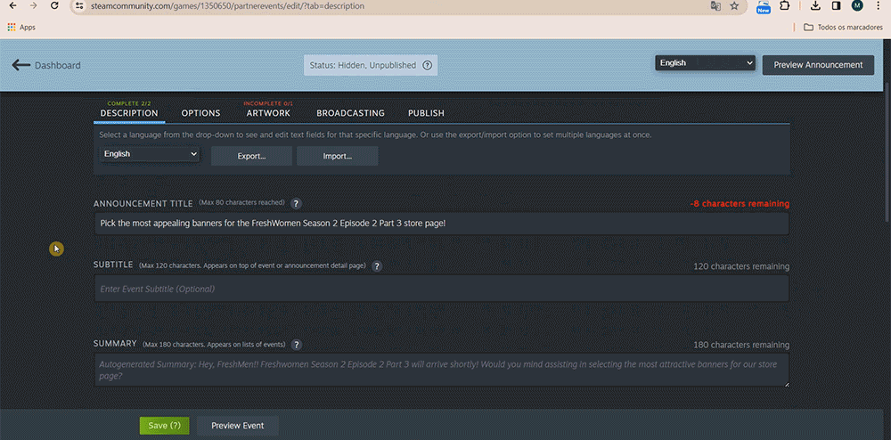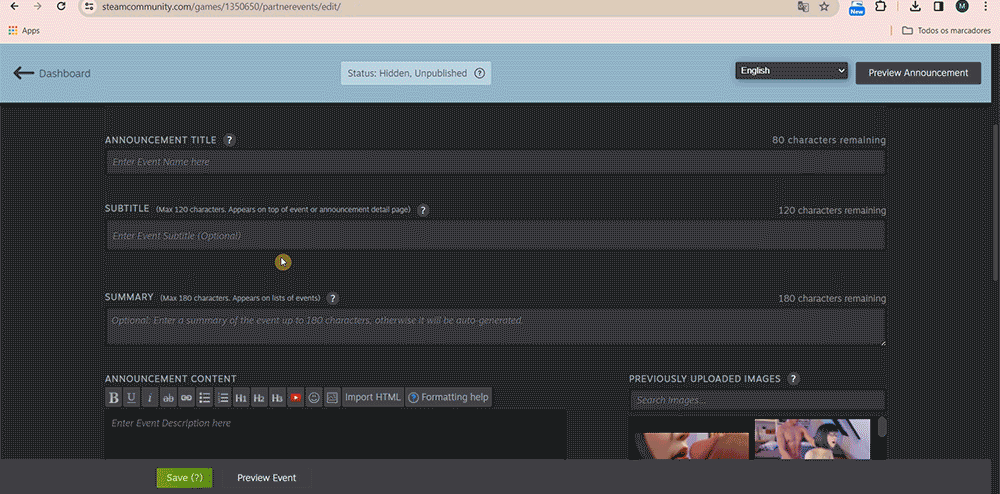 Click on "Create new Event or Announcement" (https://steamcommunity.com/games/1350650/partnerevents/create)
