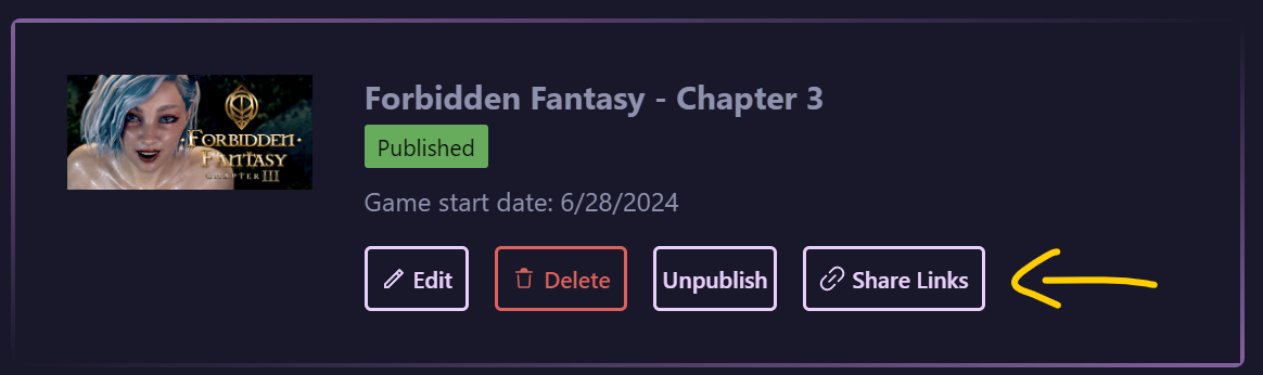 After your game is submitted and approved, go to your dashboard and click "Share Links"