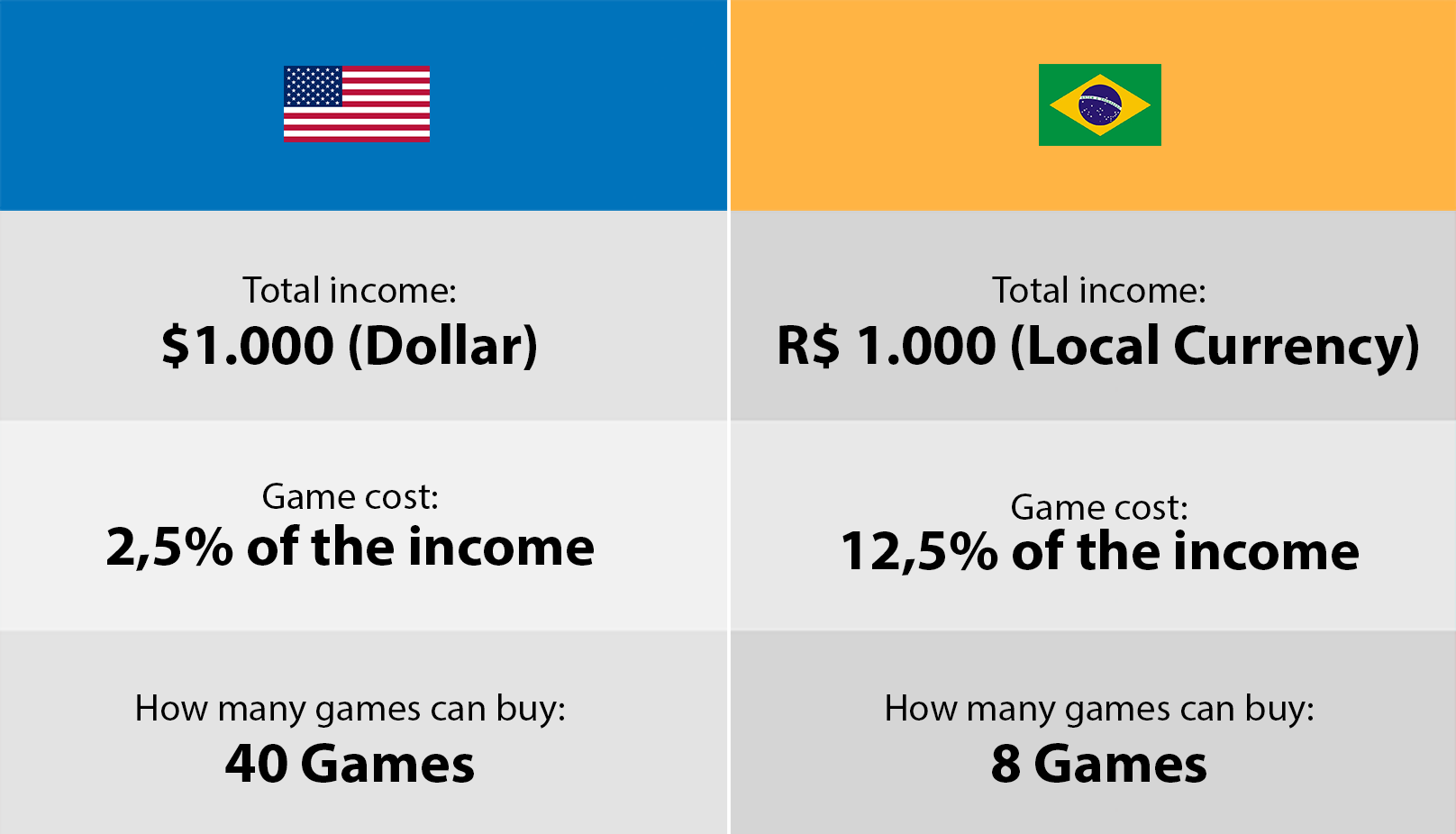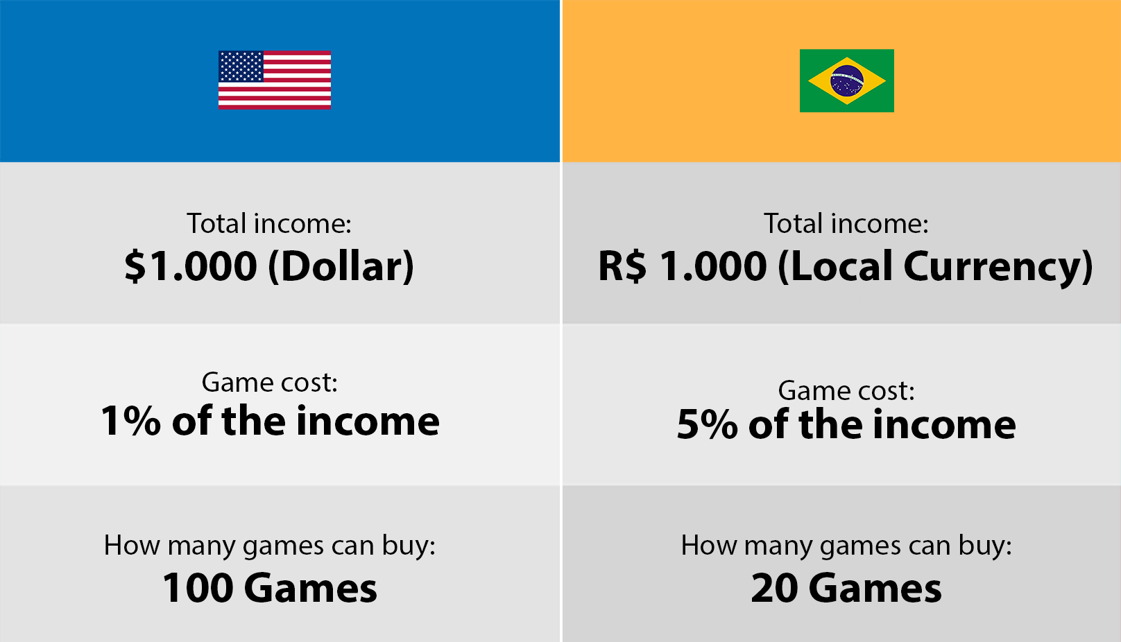 Now picture this: a player in the United States and another in Brazil want to buy your game. Both of them have the same income in their local currencies $1.000 and R$ 1.000 (Brazilian Reais)